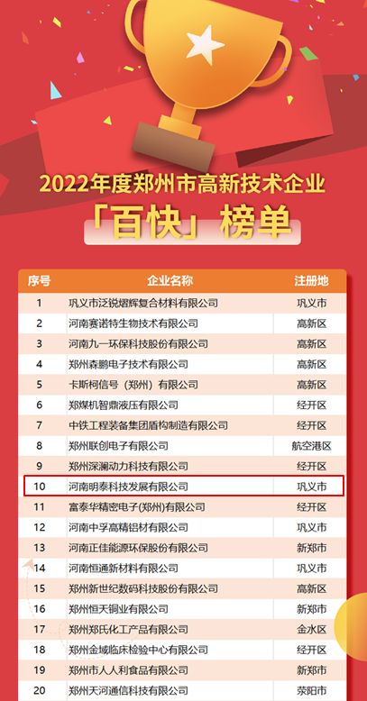 12月29日,鄭州市科學技術(shù)情報研究所發(fā)布2022年度鄭州市高新技術(shù)企業(yè)“雙百”榜單,集團子公司河南明泰科技發(fā)展有限公司作為“老牌”國家高新技術(shù)企業(yè)榮登榜單。